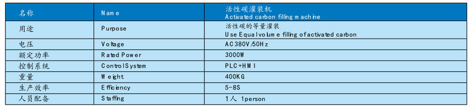 It is specially used for the equal filling of activated carbon and carbon, and can be produced in equal volume and equal weight according to customer requirements. Optional automatic carbon sink for feeding, automatic carbon sink for dust removal of activated carbon.