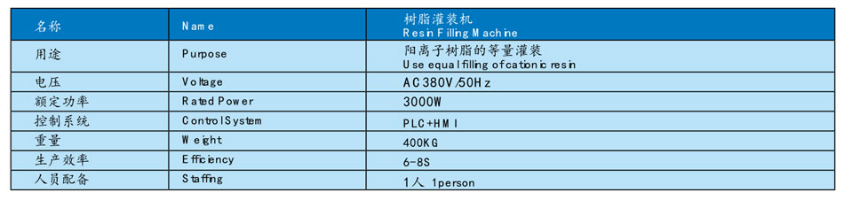 由于阳离子树脂材料具有粘性及湿性。传统灌装工艺不能满足等量灌装要求,本地根据阳离子树脂的材料特性专门定制。可设置阳离子树脂的灌装容量。